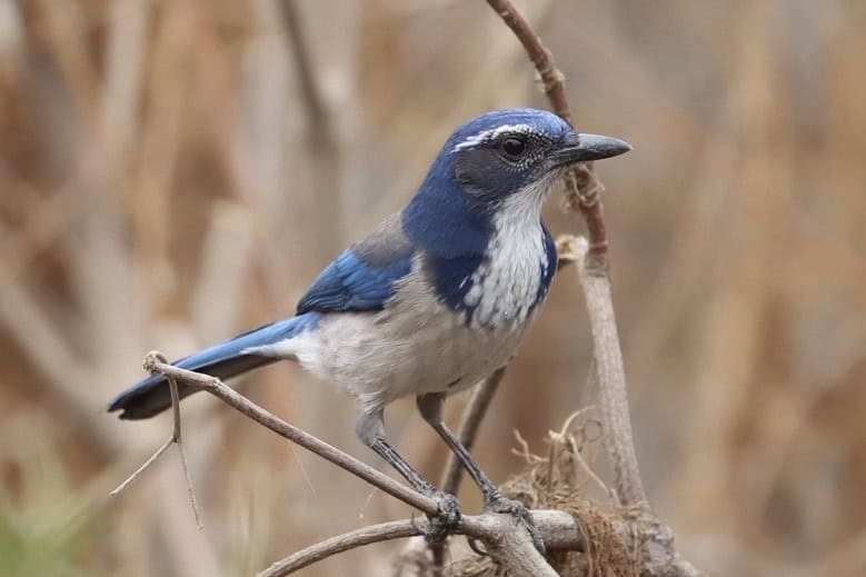 It has a deep blue body contrasted by a white belly and a gray back, with a clearly defined breast band. This feature distinguishes it from the Woodhouse’s Scrub-Jay, which has duller blue feathers, grayish underparts, and a less pronounced breast band.