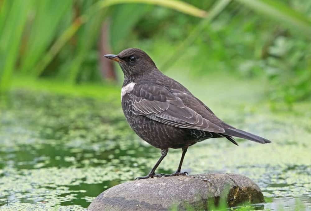 Male Ring Ouzels feature a white crescent marking on their upper chest, while females display a dusky brown color with a pale, crescent-shaped bib.