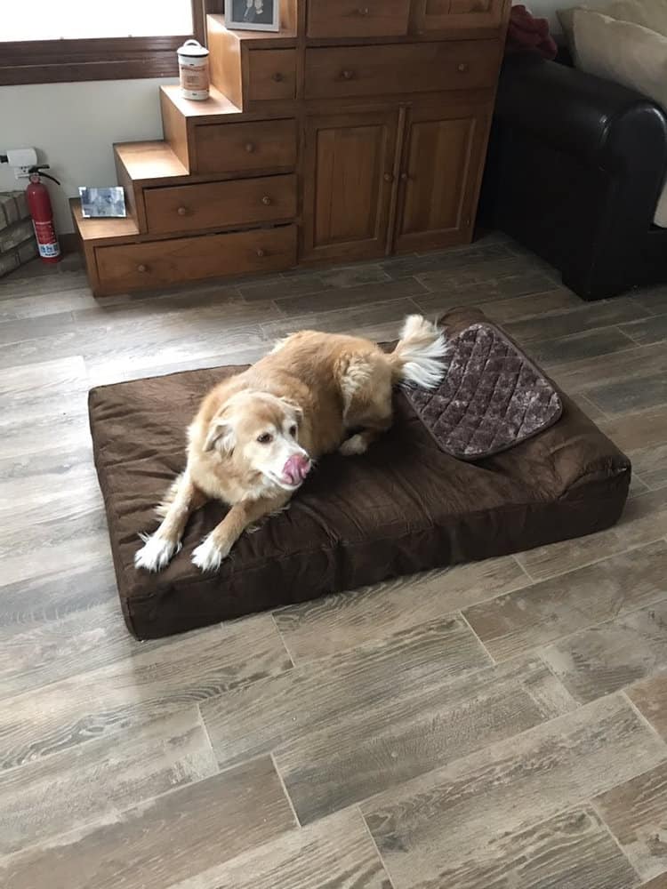 Kenny’s human momma intended to purchase a bed suitable for her big puppy, but the small size of the bed didn’t match Kenny’s stature.
