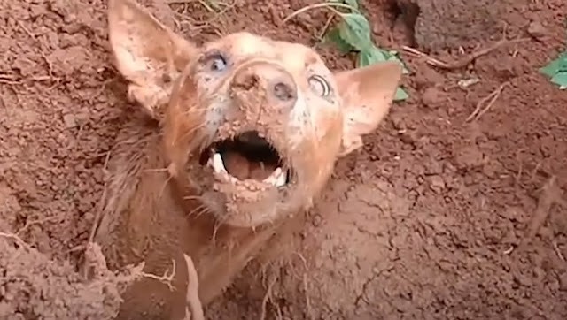 With careful precision, they worked tirelessly to free the distressed mother dog from her muddy confinement.