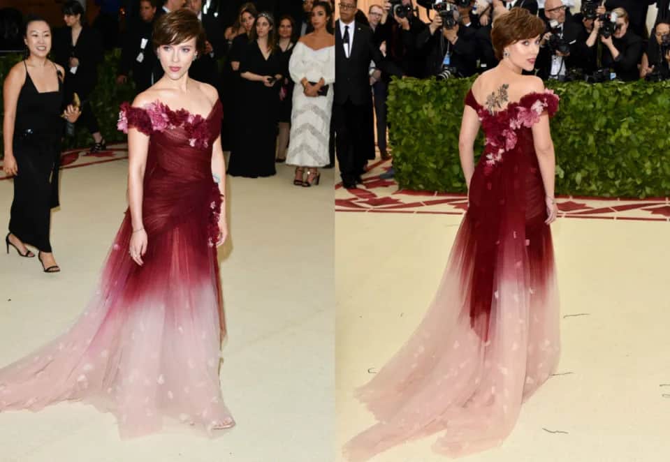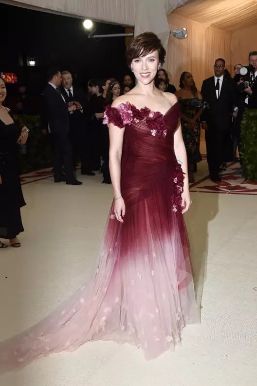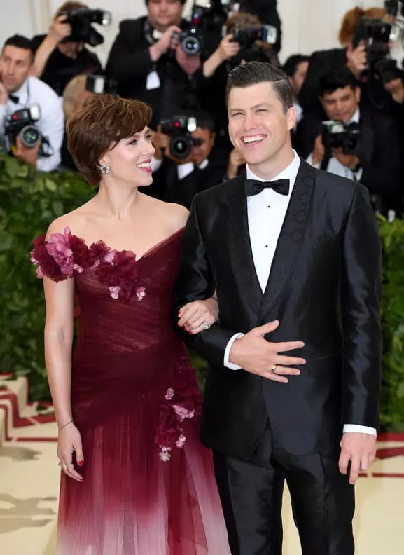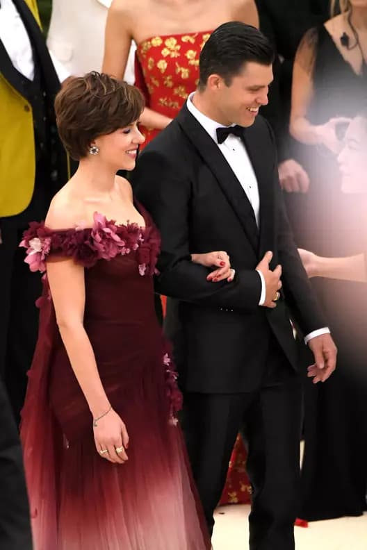 Walking down the red carpet with her partner, Colin Jost, Johansson made a striking appearance in a captivating two-toned burgundy ombre gown created by the renowned fashion label Marchesa.