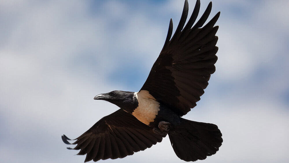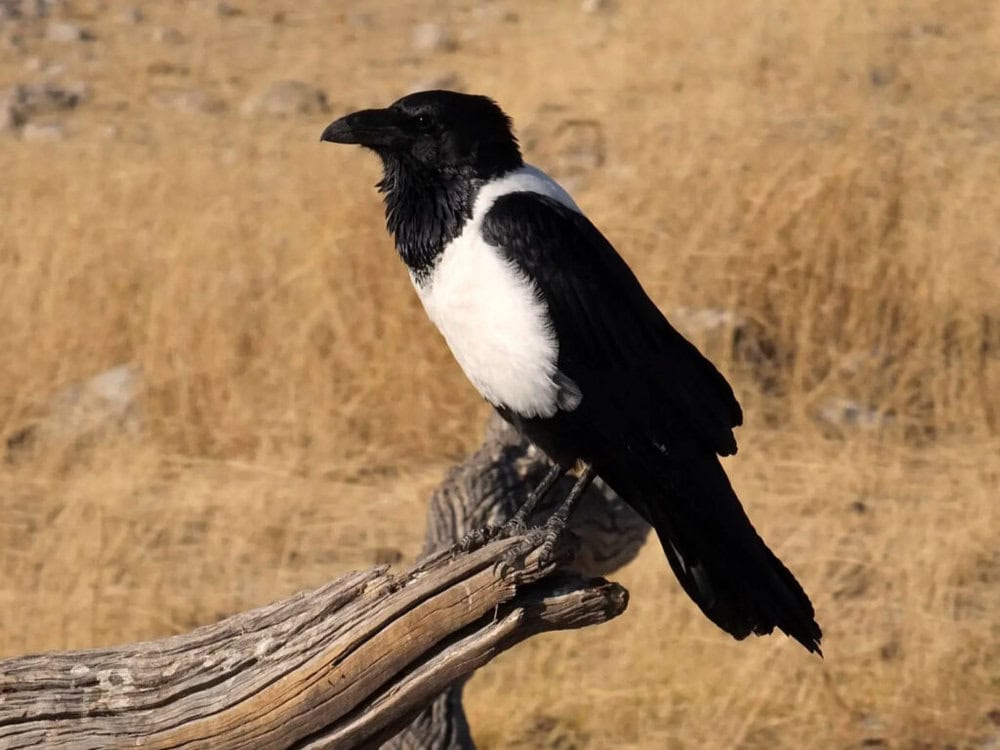 Standing about 18 inches tall, the Pied Crow’s most noticeable features include its mainly black feathers and a striking white patch on its chest and collar.
